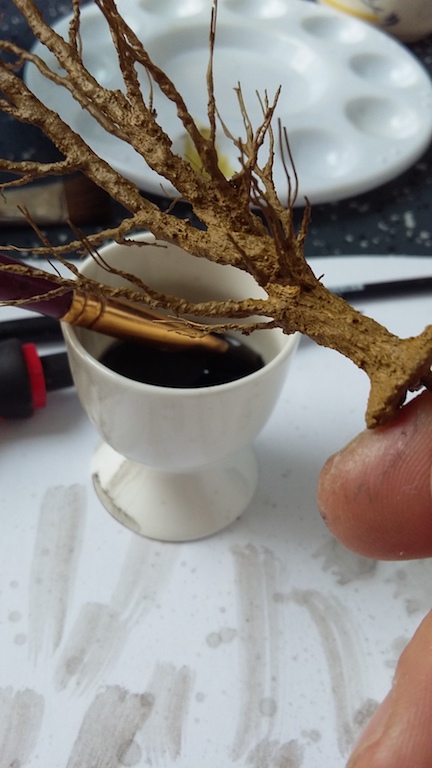 11) Nach den Trocknen kommt der nächste Anstich wieder mit dem selben Gemisch wie vorher nur wird jetzt getupft bis die groben Verdrillungen verschwinden. Am Stamm wird jetzt mehr aufgetragen damit mit spitzen Werkzeug Rillen in denn Stamm und in denn Hauptästen erzeugt werden kann.