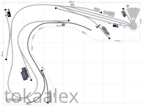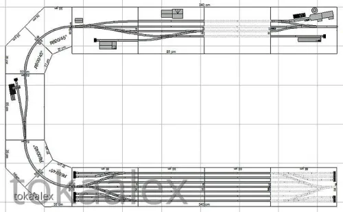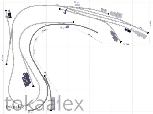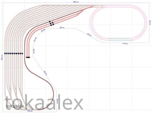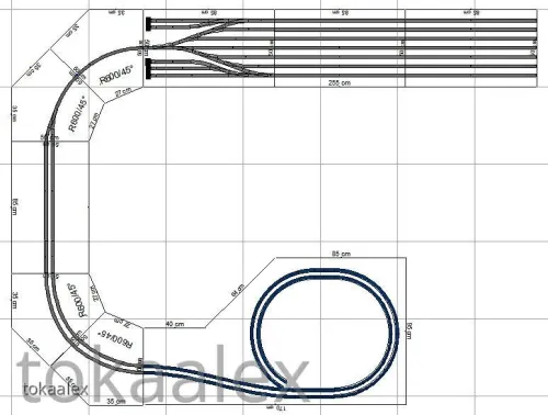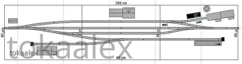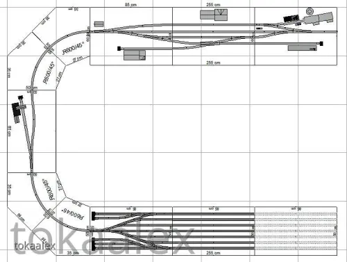 Die endgültige Variante des Bahnhofes, ob wie oben, gespiegelt oder doch in einer weiteren der zahlreichen von mir geplanten Varianten steht noch nicht endgültig fest und wird erst kurz vor Baubeginn entschieden. Ein weiterer Grund dafür liegt auch in der eingeplanten Kreuzung, die es ja bekanntlich von Kuehn so nicht gibt. Ein ungarischer Kleinserienhersteller baut zwar solche Sachen und bei diesem habe ich auch schon vor einiger Zeit angefragt, aber das ist weiterhin sehr fraglich. Alternativ würde dort auch eine wohl in absehbarer Zeit anzukündigende DKW (falls 10°) von Kuehn passen, aber wenn die von der Ankündigung bis zur Auslieferung wieder genauso lange braucht wie die 10°-Weiche, dann kann ich das auch getrost vergessen. Daher wurde auch hier eine Alternative ähnlich des obigen Bahnhofes, aber ohne Kreuzung/DKW entworfen ... der mir mittlerweile fast besser gefällt.
