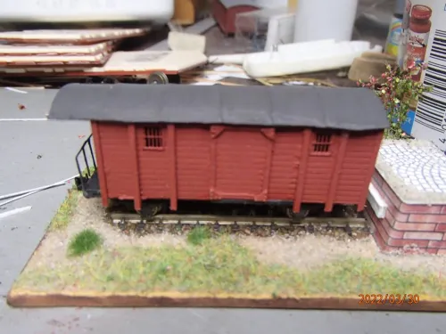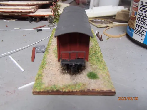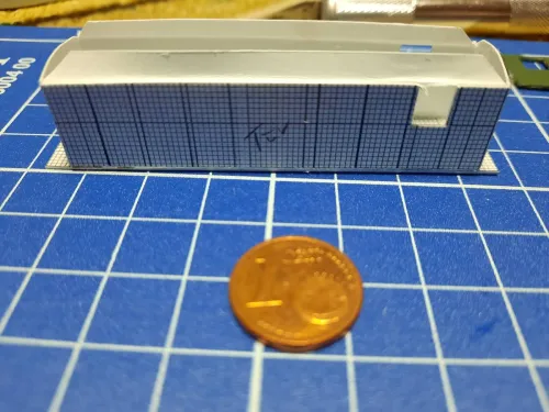 Über der Tür werde ich die Abdeckung ergänzen und das Dach mit Papierstreifen als Dachpappenimitat bekleben.
