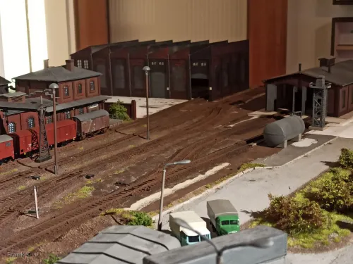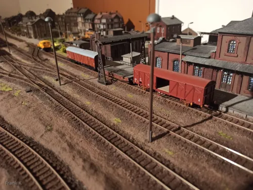 wird Zeit, mal wieder hier Staub zu wischen. Mittlerweile ist es an der Erweiterung vorangegangen, der mittlere Bereich rund um die Gleise hat seine landschaftliche Gestaltung bekommen. Rund um Lokschuppen und Werkhalle wuchert nun Grünzeugs. Und der Wagenbestand ist mittlerweile fast fertig durchgealtert.