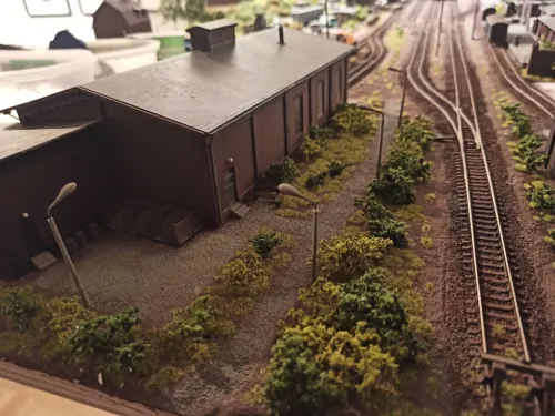 @ Jens: Es ist tatsächlich der Lokschuppen Auhagen 13342. Den Wasserturm habe ich weggelassen und den im Baustaz enthaltenen Werkstattanbau um 90 Grad gedreht. Dafür musste ich dann aus Pappe ein neues Dach schneiden. Aber so gefällt es mir am besten.