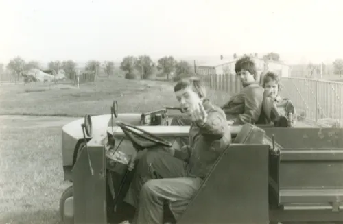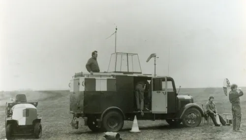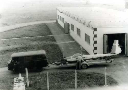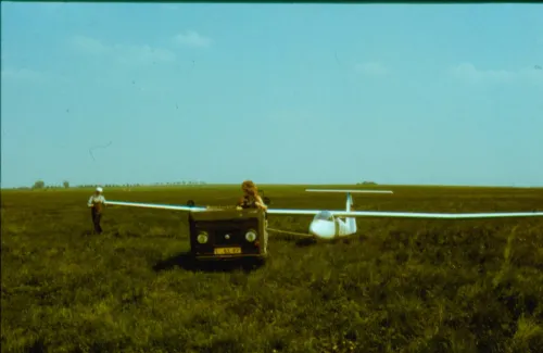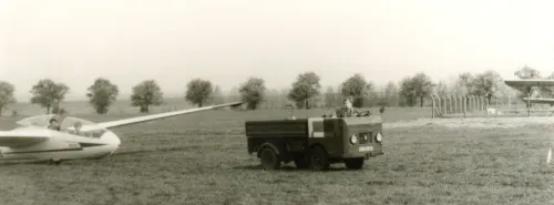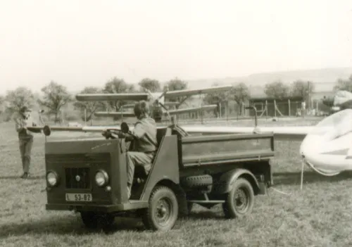 Der SKP (Startkontrollwagen) war im ersten Leben eine Feuerwehr von Mercedes und noch sehr gut im Originalzustand erhalten. Er wurde Ende der 1980er Jahre von der DEFA gegen ein moderneres Fahrzeug getauscht. Die gelb-roten Teile sind Herkules-Seilwinden aus der CSSR. Die vordere ist eine Herkules III - Winde, die hintere eine Herkules IV - Winde. Die Herkules III kann selbstständig fahren und hat sogar eine für die Straße notwendige Beleuchtung. Die modernere Herkles IV ist nur ein Anhänger und muss zum Start geschleppt werden (was nervig war, besonders wenn im Laufe des Tages die Startrichtung geändert wurde). Beide haben luftgekühlte Tatra-Motoren. Im Bild schleppt ein 17-jähriger Schüler mit der Herkules III ein Segelflugzeug in die Luft.