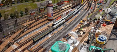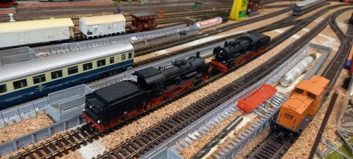 In den letzten Tagen mal nichts an der Verkabelung des Bahnhofs gemacht aber dafür eine Lok - BR 38 von Roco - instandgesetzt . Ich habe das Modell vor einigen Jahren im großen Kaufhaus mal als Bastelschrott gekauft und mir gedacht für 60€ kann man nicht viel falsch machen da die Lok über einen Sounddecoder verfügt . So fristete sie nun einige Jahre ihr Dasein in der Vitriene . Im Dezember letzten Jahres habe ich mich dann auf die Lok besonnen und nach einer neuen Platine gesucht . Bei der Firma Schönwitz bin ich dann auch fündig geworden , für 40€ habe ich nicht lange überlegt und zugegriffen . Nun hatte ich die Lok mit einer zerlöteten Platine und die neue Platine . Gehäuse runter vom Tender ( geht gut sind nur 4 Schrauben ) alte Platine abgelötet , die neue rein und siehe da die Lok fuhr und machte Musik . Ein Problem blieb . Das Licht wollte nicht , konnte auch nicht da es mitmal auf der Taste F1 lag . Das Problem ist auch gelöst und alle funktioniert nun wie ich es haben möcht . Nun sind es zwei 38er die ihren Dienst versehen können
