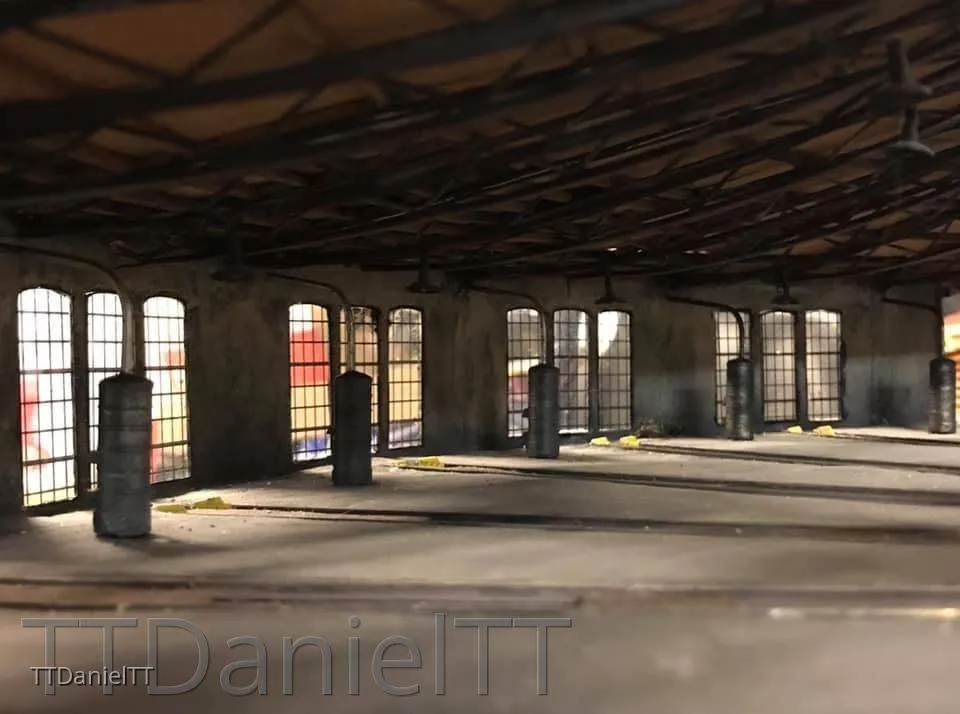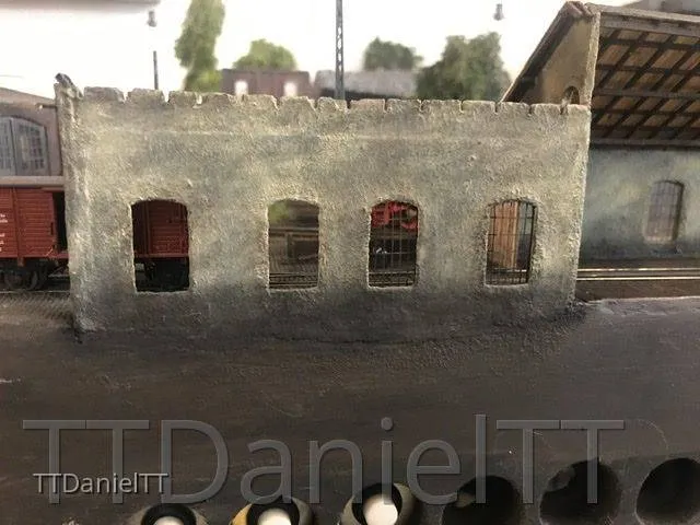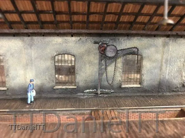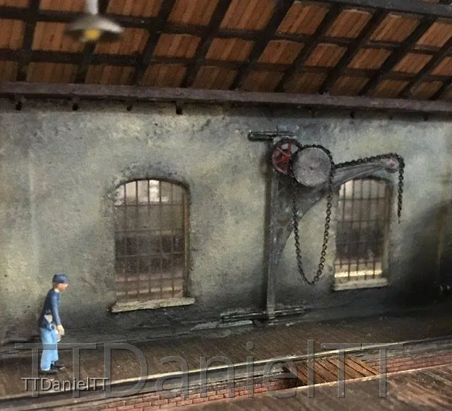 Die Innenwand der Triebwagenhalle wurde nochmals überarbeitet und auch der Kleine Kran wurde montiert.