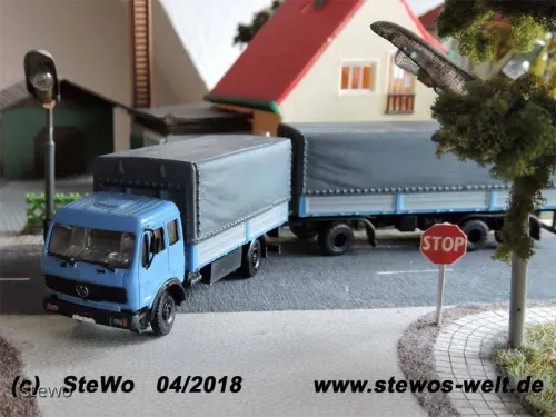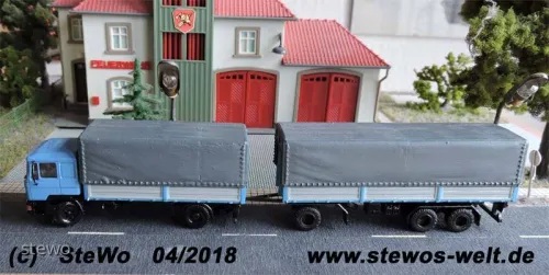 Kurze Zeit später gab es dann sogar zwei neue LKWs. Diesmal allerdings handelte es sich um Pritschen-LKWs mit dreiachsigen Anhängern. Diese Kombination war bei einigen Kunden von SteWo-Trans günstiger, da auch mal ohne Anhänger rangiert werden konnte. Und das Fahren mit Anhängern waren die Piloten von SteWo-Trans ja noch gewöhnt. Bei den Zugfahrzeugen gabs diesmal einen zweiachsigen MAN F90 und einen zweiachsigen MercedesBenz SK. Wer der Hersteller der Anhänger war, konnte ich noch nicht herausfinden.