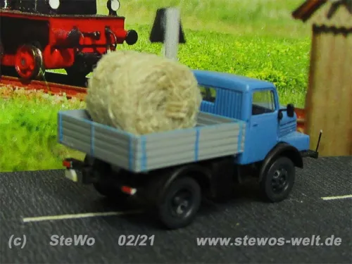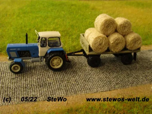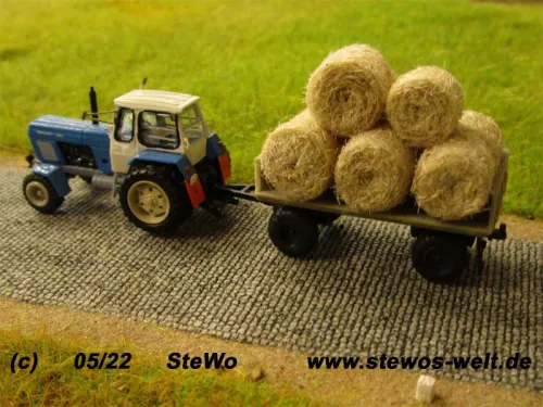 Den Umbau des ZT ist hier bereits schon vol längerer Zeit beschrieben worden. Das Anhängsel ist ein HW60 aus dem Hause Hädl. Dem wurde die linke Seitenwand entfernt. Naja, wie die Rundballen zu machen sind, steht ja genau obendrüber.