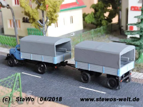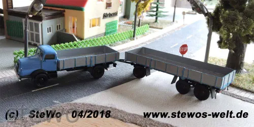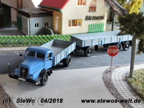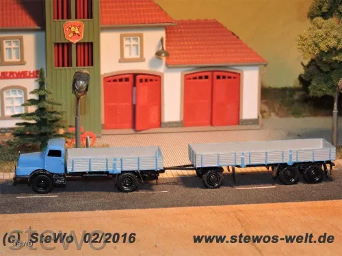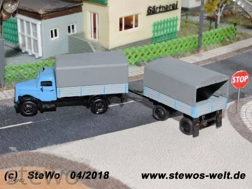 Den H6 bekam SteWo-Trans vom ortsansässigen Kraftverkehr. Als die den H6 aussonderten, war er ziemlich heruntergekommen und abgewirtschaftet. Fahrerhaus war teilweise angegammelt und die Pritsche hatte Lochfraß. Aber das Rückrad war halbwegs in Ordnung. Also hatten die Schlosser von Stewo-Trans wieder alle Hände voll zu tun. Nach umzähligen Stunden (oder besser Tagen und Wochen) stand dann ein fahrbereiter H6 auf dem Hof. Beim Anhänger handelt es sich um eine Eigenkonstruktion von SteWo-Trans. Sie hatten nach dem Kriege alles was sich so auftreiben ließ gesammelt und gehortet. Darunter fand sich auch ein dreiachsiges Anhängerfahrgestell. Das gammelte immer noch auf dem Geländer vor sich hin. Es mangelte ja immer an geeignetem Zugmittel. Also wurde auch dieses Fahrgestell wieder reaktiviert, instand gesetzt und mit einem neuen Aufbau versehen. Und so stand dieser Zug viele Jahr im Einsatzdienst bei Stewo-Trans.