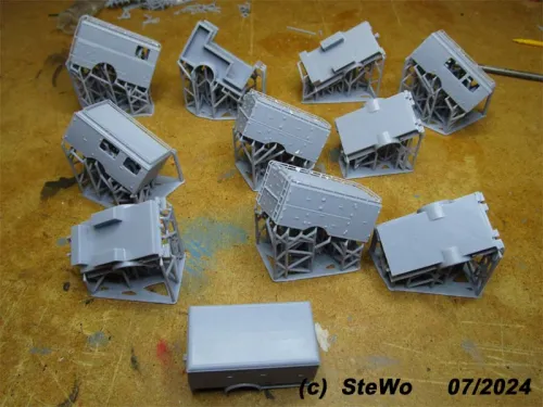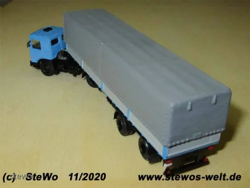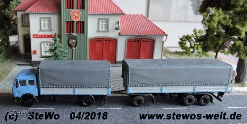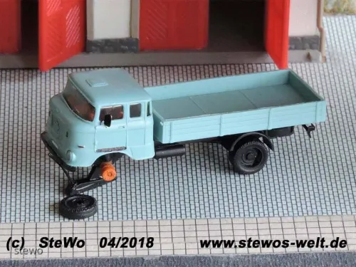 Bei dem Modell verhielt es sich fast so ähnlich. Zu Beginn hatte ich nur ein Fahrerhaus. Das habe ich vor Jahren auf dem Messestand von Firma Gabor aus der Grabbelkiste erstanden. Alles andere wurde dann aus dem immer grünen Zeugs dazu gebastelt. Abgefangen über Rahmen, Fahrerhaus Untzerteil bis zur Pritsche. Der Anhänger ist eine Eugenkonstruktion von mir. Es hat kein direktes Vorbild. Aber solche Anhängsel gabs ja. Also warum nicht auch bei SteWo-Trans.