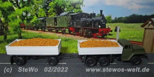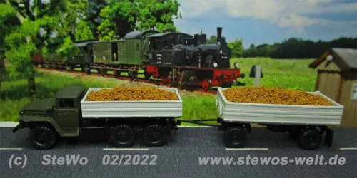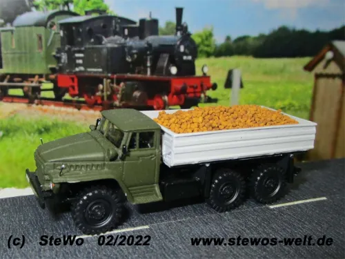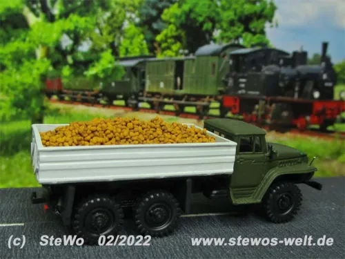 Das Modell ist schnell gebaut. Ein Ural aus ... Herstellung (keine Ahnung von wem der ist. Lag noch so rum) mit Rädern von Hädl und selbstgebauten Spiegeln versehen. Die Militärprische ist durch einen Zwischenrahmen und einem HW60-Aufbau ebenfalls von Hädl getauscht worden. Noch ein HW80 dazu und los ging der Kartoffeltransport.