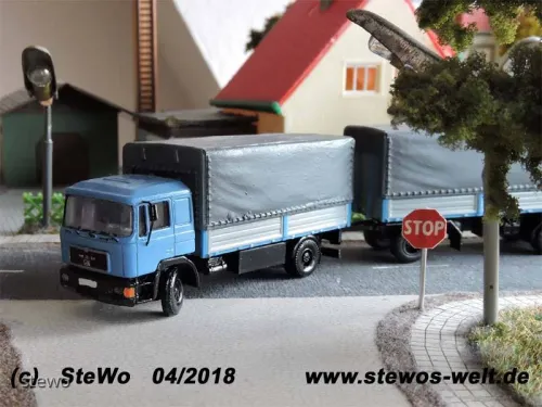 Der Wechselpritschenzug hat ein Modell von Schirmer als Grundlage. Dort wurde das Fahrerhaus mit einem MAN-Fahrerhaus von Gabor getauscht. Die Wchselpritschen sind umlackierte Teile von Tillig.