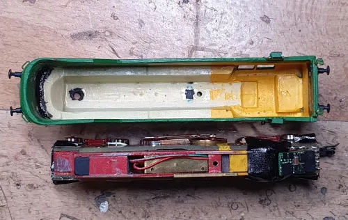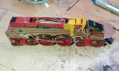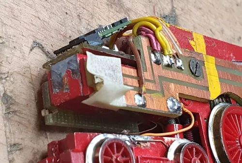 Ich habe zwei 1mm-Messingdrähte in die Rauchkammertür gelötet. Man sieht es im ersten Bild, das sie durch gehen. Anschließend werden die Drähte ausgerichtet, bis die RKT gerade und bündig sitzt. Und etwas beschliffen für eine leichte Rastung.